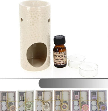 Mits op voorraad, enkel verkrijgbaar in de winkelGeschenkset brander met geurolie en kaarsjes- Verkoper